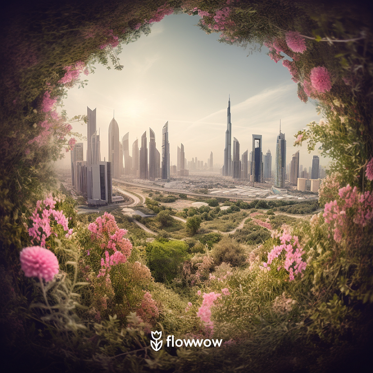 Leveraging cutting-edge AI imaging capabilities, Flowwow aimed to bring forth a vision of Dubai adorned with lush greenery and vibrant blooms, creating a harmonious blend of nature and architecture.