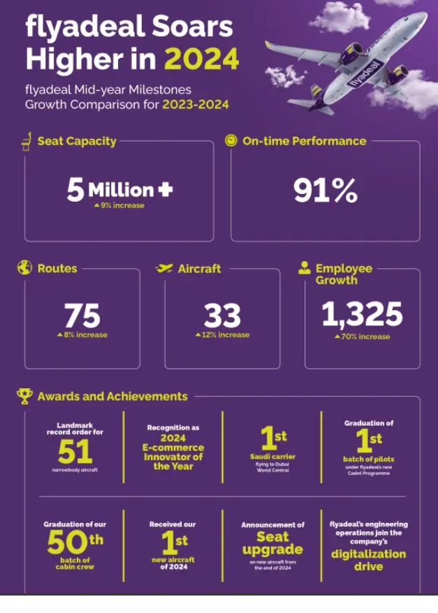 flyadeal, one of the youngest and fastest growing low-cost airlines in the Kingdom of Saudi Arabia and across the Middle East, has announced impressive 2024 half year performance figures with growth across its operations.