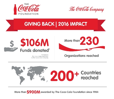 The Coca-Cola Foundation and The Coca-Cola Company together donated more than US $106 million to more than 230 organizations in 2016. These contributions will directly benefit communities across more than 200 countries and territories, with approximately 97 percent of the grants focused on The Coca-Cola Company’s core sustainability priorities of women, water and community well-being.
