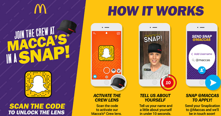 In Australia, McDonald’s and Snapchat partnered this summer for the “Snaplications” lens. A first for both companies, the sponsored lens lets Snapchatters apply to a job directly through the app. The branded lens shows the user in a McDonald’s uniform and asks them to record a 10-second video showing their personality, which is sent directly to McDonald’s. After the application is reviewed, candidates may be invited into a more traditional application process.