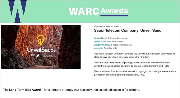Saudi Telecom Company’s (STC) “Unveil Saudi” campaign by J. Walter Thompson Saudi Arabia has won WARC’s Special, Long-Term Idea award, and Gold, for its content strategy that demonstrated achievement of brand business goals. The WARC Awards scheme is a global search for next-generation marketing effectiveness. The Special Long-Term Idea Award in particular, recognises content strategy that has delivered sustained success for a brand, and is awarded only once in the year.