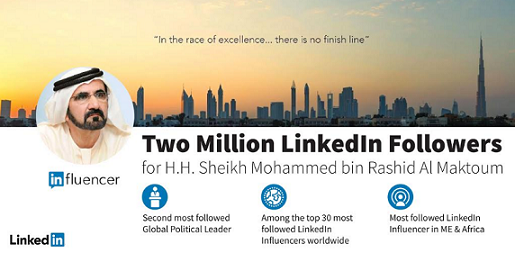 His Highness Sheikh Mohammed bin Rashid Al Maktoum is the second most followed Global Political Leader in LinkedIn Influencer program
