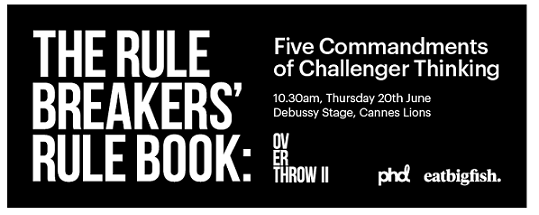 This new generation of challengers is also the subject of PHD and eatbigfish’s seminar – The Rule Breakers’ Rule Book – on the Debussy Theatre stage on Thursday 20th June, 10.30–11.00am. The co-authors of the book, Malcolm Devoy, PHD EMEA’s chief strategy officer, and Adam Morgan, founder and partner of eatbigfish, will discuss the five commonalities in marketing and media behaviours these challengers seem to use.