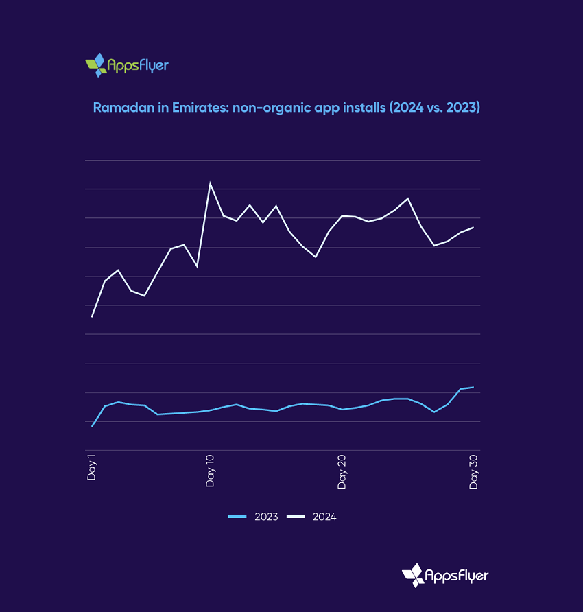 In analysing key mobile app trends through Ramadan, and comparing these to the weeks leading up to the Holy Month, AppsFlyer’s research showed that in the Middle East, non-organic instals (NOIs) — those driven by marketing campaigns — of mobile apps were up by 27% this year, which is even more pronounced than the 21% spike observed during Ramadan 2023.