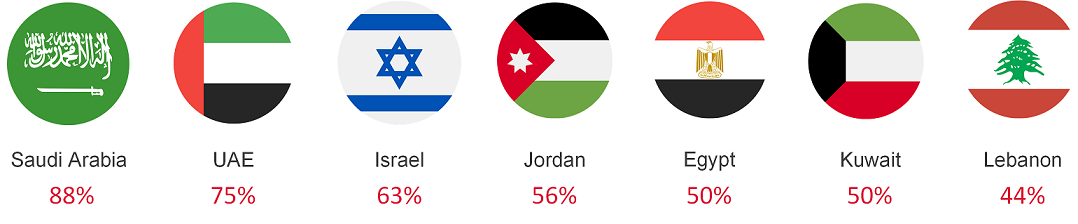 According to the analyzed data, malicious actors’ seven key targets were Saudi Arabia (88%), the UAE (75%), Israel (63%), Jordan (56%), Egypt (50%), Kuwait (50%) and Lebanon (44%) .