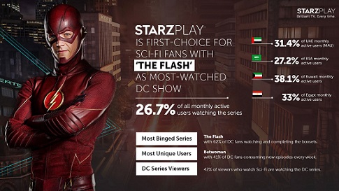 The Flash tops the binge-watching chart with 62% of STARZPLAY’s DC fans watching and completing the full boxsets. The show featuring DC’s fastest man alive is also amongst the most-watched series in MENA with 26.7% of STARZPLAY’s monthly active users (MAUs) addicted to the action-packed superhero series.