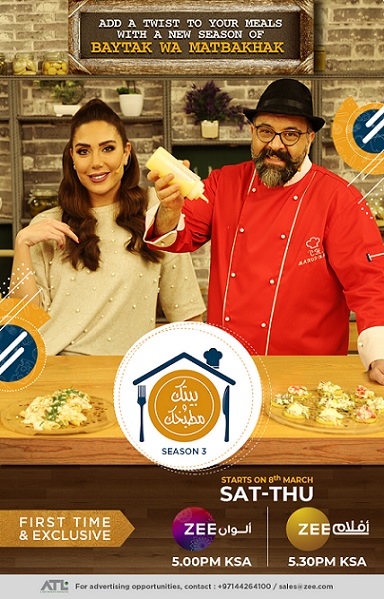 Premiering today, Baytak w Matbakhak, season 3 will air from Saturday to Thursday at 5:00 PM KSA on Zee Alwan and Same days at 5:30 PM KSA on Zee Aflam.