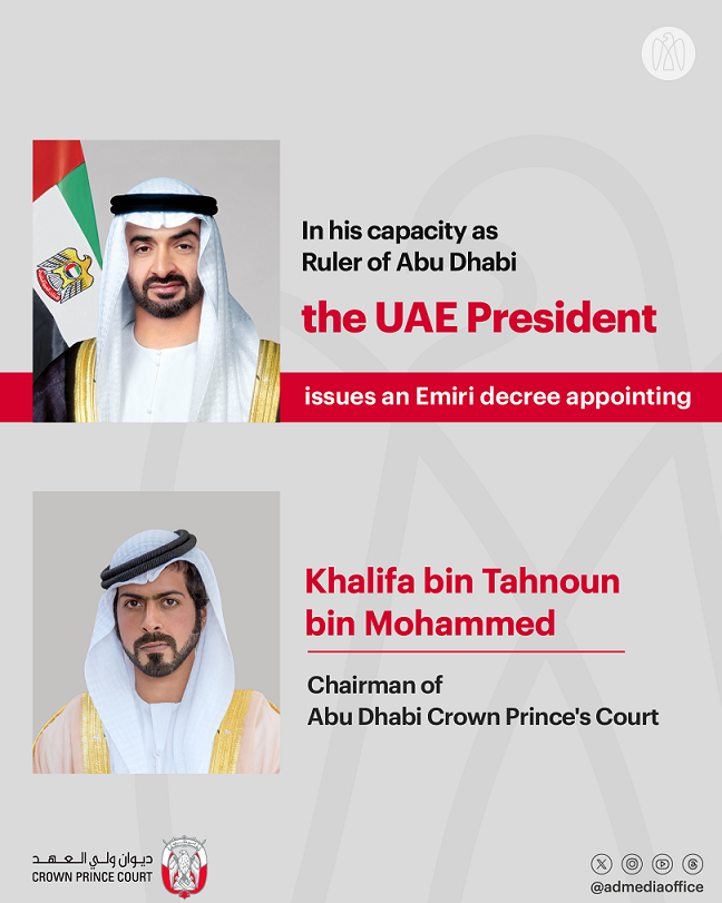 His Highness Sheikh Mohamed bin Zayed Al Nahyan, President of the UAE, in his capacity as Ruler of Abu Dhabi, has issued an Emiri decree appointing His Excellency Sheikh Khalifa bin Tahnoon bin Mohammed Al Nahyan as Chairman of the Abu Dhabi Crown Prince’s Court.